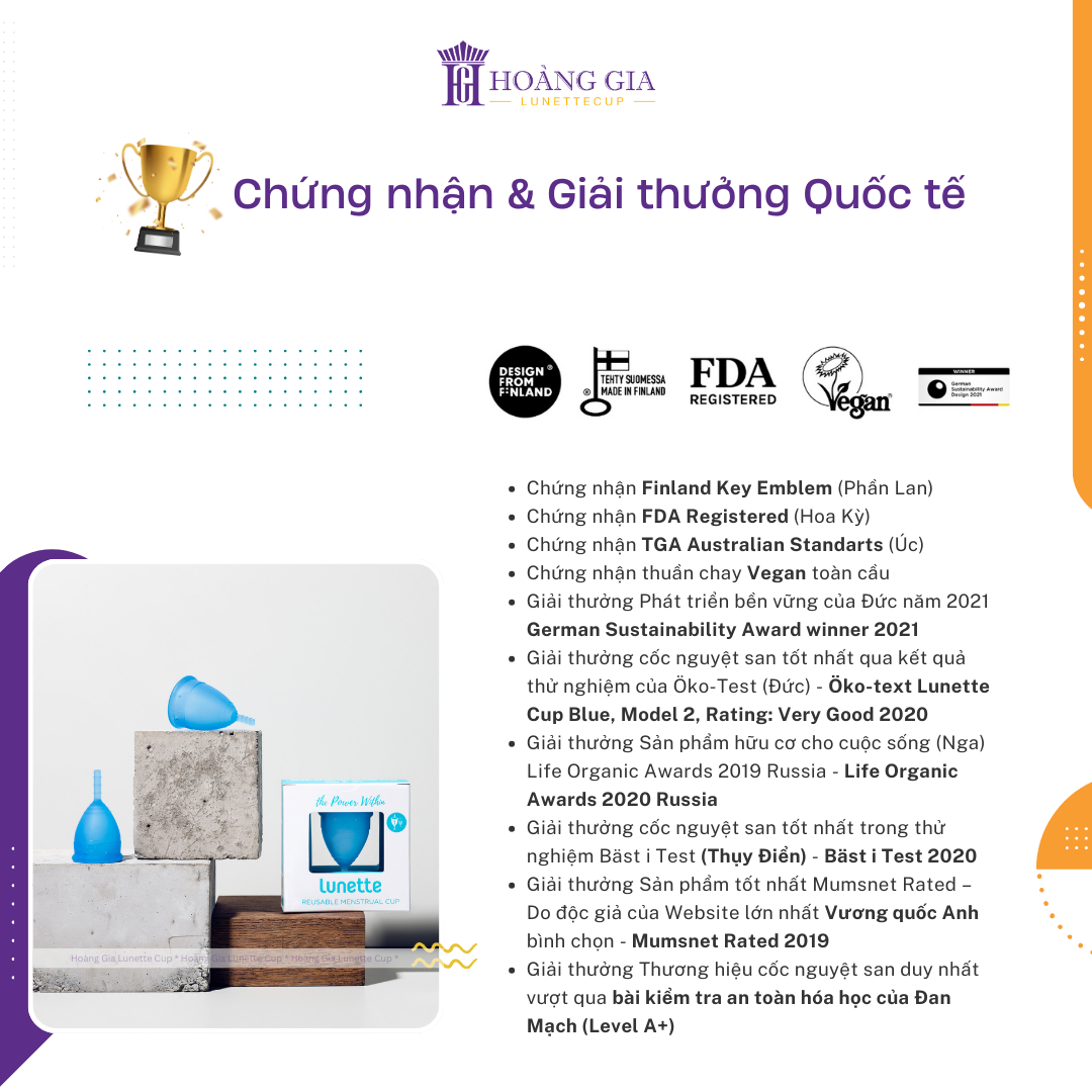 Lunette tự hào là sản phẩm "Made in Finland", được sản xuất theo tiêu chuẩn nghiêm ngặt của châu Âu. Phần Lan nổi tiếng với những sản phẩm chăm sóc sức khỏe chất lượng cao và Lunette không phải là ngoại lệ. Sản phẩm này đã nhận được nhiều chứng nhận quốc tế về an toàn và hiệu quả.