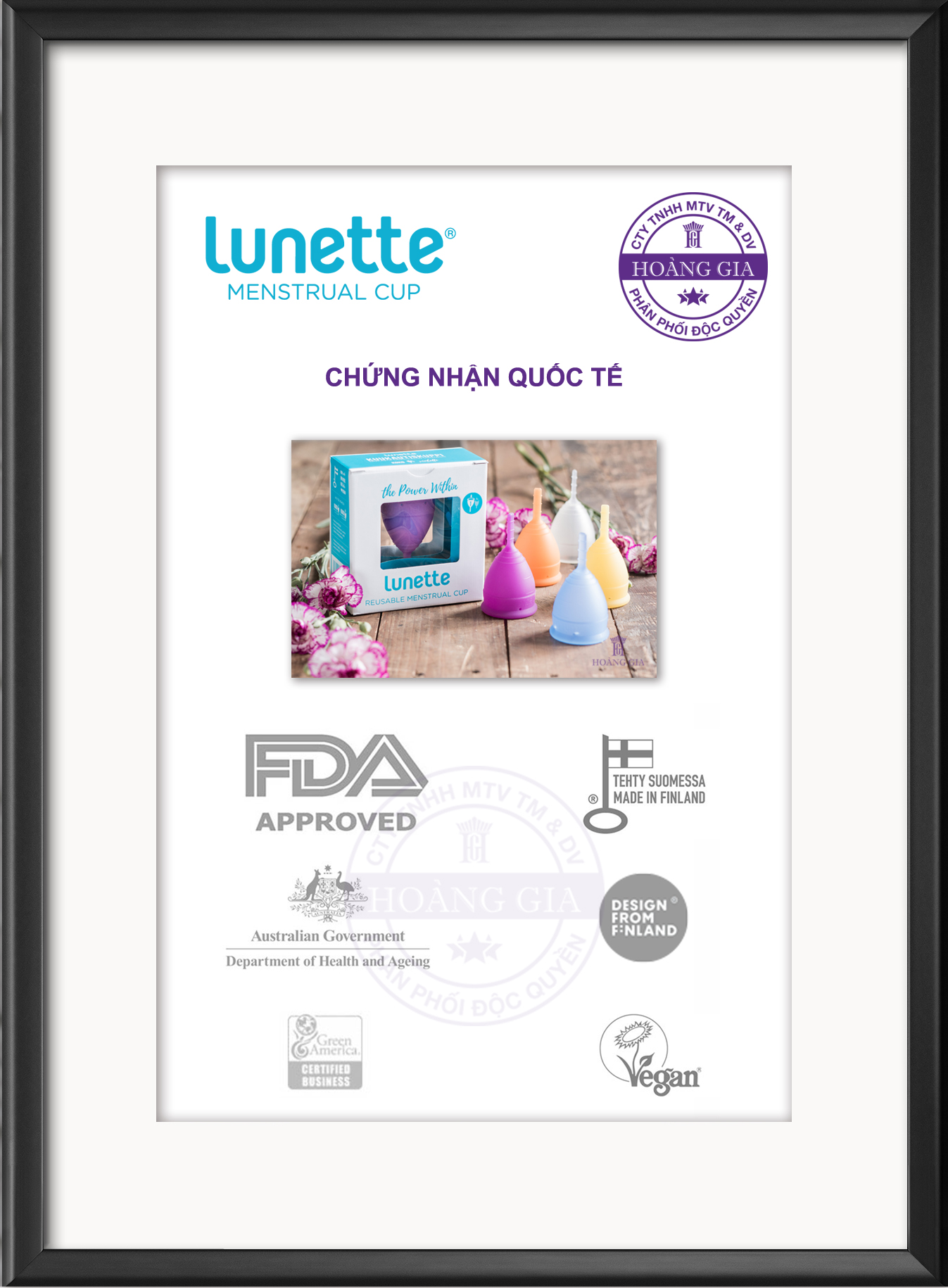 Sản phẩm Lunette được chứng nhận an toàn bởi: Cục quản lý Thực phẩm và Dược phẩm Hoa Kỳ FDA (USA); Cục quản lý dược phẩm TGA (Úc) và Phần Lan