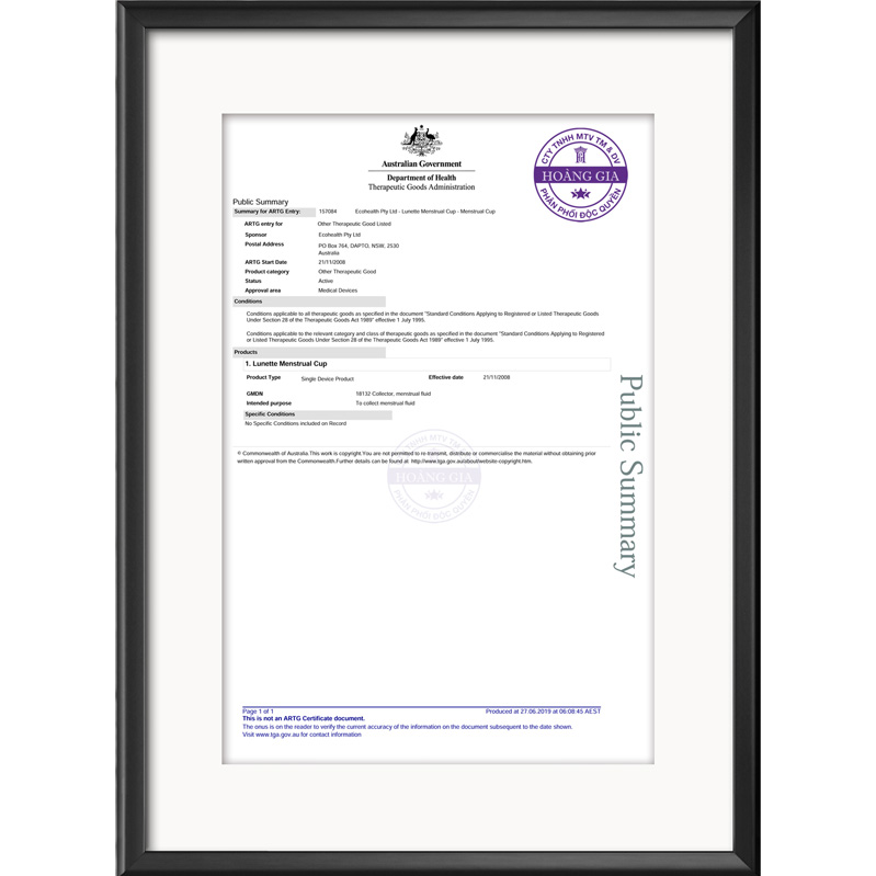 Cơ quan quản lý dược phẩm (TGA) là cơ quan quản lý thuốc và thiết bị y tế của Úc. Cốc nguyệt san Lunette được liệt kê trong Danh bạ Dược phẩm trị liệu Úc (ARTG), AUST L157084, vào năm 2007 cho chiếc cốc sillicone ĐẦU TIÊN trên thế giới được bán hợp pháp cho phụ nữ Úc.