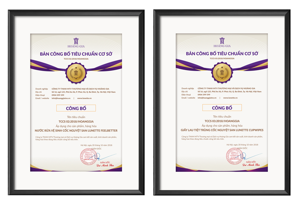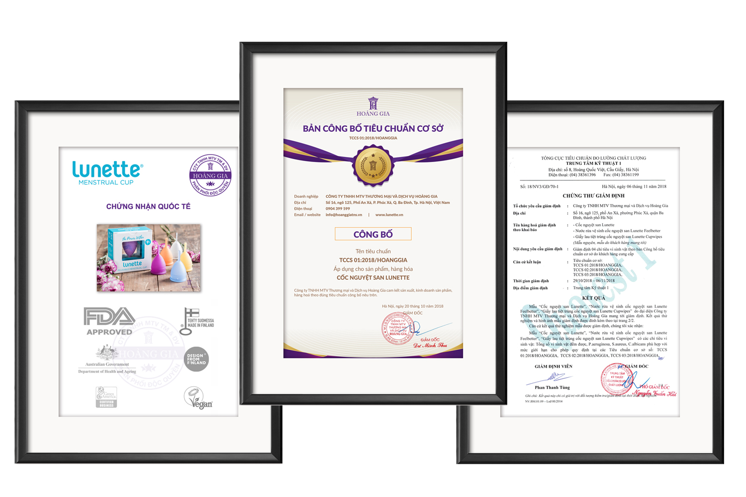Kết quả kiểm nghiệm cho thấy các sản phẩm cốc nguyệt san Lunette và phụ kiện vệ sinh cốc nguyệt san đáp ứng các yêu cầu, tiêu chuẩn của Bộ Y tế Việt Nam, sản phẩm Lunette sử dụng vật liệu silicon cao cấp, an toàn có khả năng kháng khuẩn, vi sinh vật, phù hợp và được phép lưu hành tại Việt Nam (TCCS 01:2018/HOANGGIA; TCCS 02:2018/HOANGGIA; TCCS 03:2018/HOANGGIA)